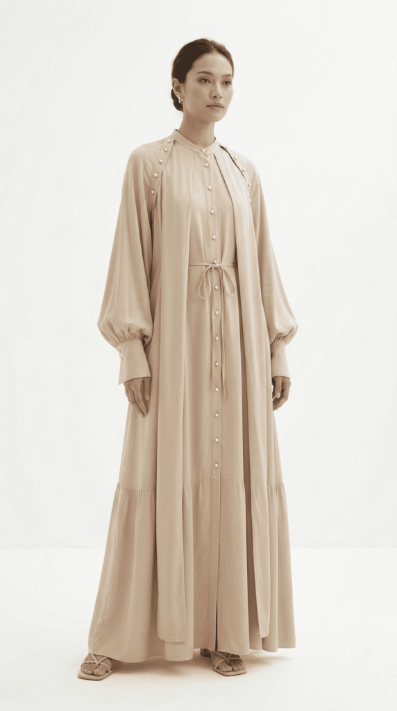 Pada gambar di atas model dress Lebaran hadir dengan potongan panjang yang jatuh natural serta detail layering yang membuat siluetnya terlihat lebih dinamis.